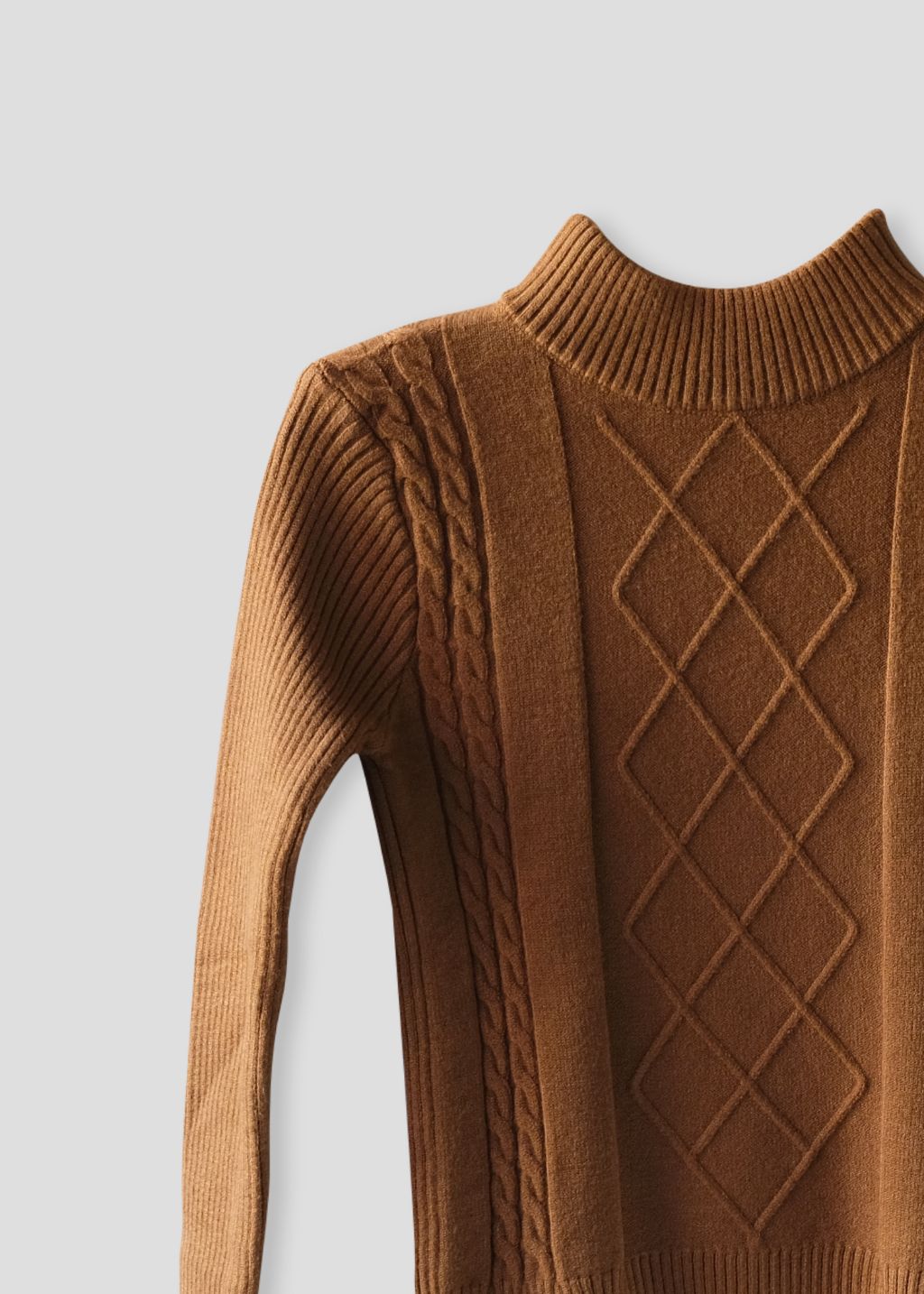 - Zachte gebreide trui met hooggesloten hals en kabelmotief.